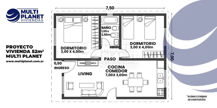 Vivienda de 52mts2 desarrollada en una planta. Consta de dos dormitorios, un baño, living y cocina comedor.